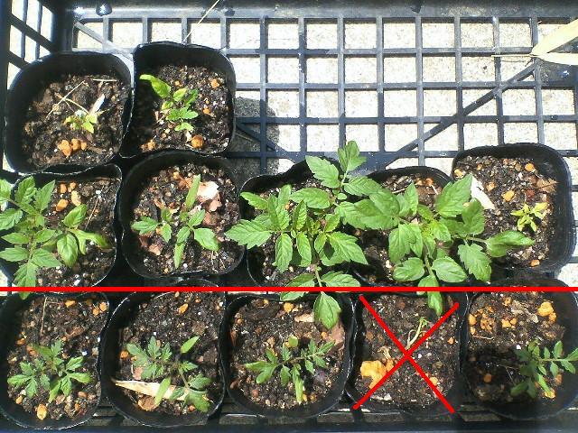 4月27日。今日、発芽した苗を3号ポットに移しました。赤線から上が小玉苗、赤線から下が中玉苗です。(小玉苗の1つは枯れてしまいました。。。)