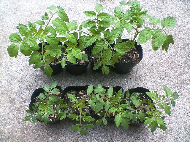 それぞれ小玉苗、中玉苗の元気な4つの苗を育てることにしました。上段4つが小玉苗、下段4つが中玉苗。ずいぶんと大きさが違います。
